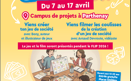 Participez au premier "Campus Créa'jeux" : un projet créatif et collectif de 2 semaines animés par des professionnels pour créer un jeu ou filmer les coulisses de création ouvert aux jeunes de 12 à 25 ans. Les participants de l'ateliers vont imaginer, tester et créer un jeu avec l’aide de David Boniffacy et vont réaliser une vidéo sur les coulisses de la création d'un jeu sous forme de making-of et d'interviews avec l’aide de Arnaud Devroute. La participation implique engagement de deux semaines pour suivre le processus de création. Le jeu et le film créés seront officiellement présentés au Festival Ludique International de Parthenay (FLIP) en juillet 2026. Il y a 24 places disponibles, réparties entre les deux ateliers : 18 places pour le groupe “création de jeux de société”, 6 places pour le groupe “création vidéo”. L’inscription est obligatoire par téléphone.
