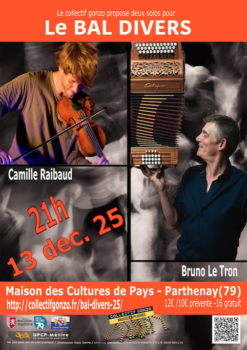 Un bal où deux esthétiques se rencontrent pour le plus grand plaisir des danseurs. Camille au répertoire du sud ouest fait sonner en cadence son violon. Bruno, avec son répertoire plus généraliste, fait sonner son accordéon de ces belles lignes mélodiques dont il a le secret. Tout deux aiment à jouer pour la danse. C’est pour cela qu’ils sont là á sonner pour la danse chacun leur tour ! Samedi 13 décembre 2025 - 21H : BAL Camille Raibaud Bruno Le Tron Pensez à reserver car la salle n'est pas très grande !