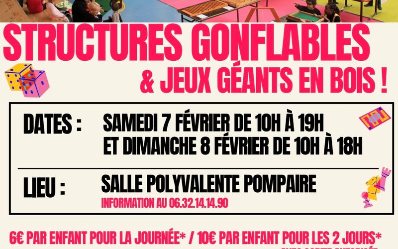 Structures gonflables et jeux géants en bois à Pompaire Les 7 et 8 février 2026, la salle polyvalente de Pompaire se transforme en un immense espace de jeux pour petits et grands ! Venez profiter d’un événement convivial autour des structures gonflables et des jeux géants en bois, idéal pour passer un moment en famille ou entre amis.