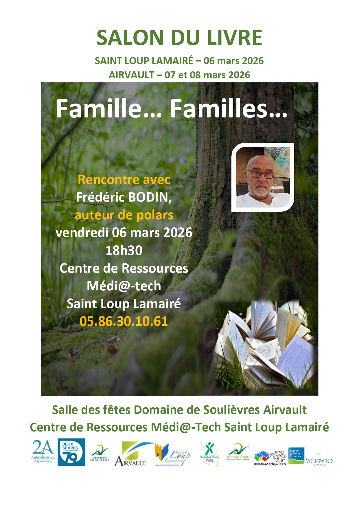 Venez rencontrer dans le cadre du salon du Livre 2026, proposé par l'association 2A et ses partenaires, l'auteur de polars Frédéric Bodin, au centre de ressources Médi@-Tech ( 32 rue de la grille, St-Loup-Lamairé).